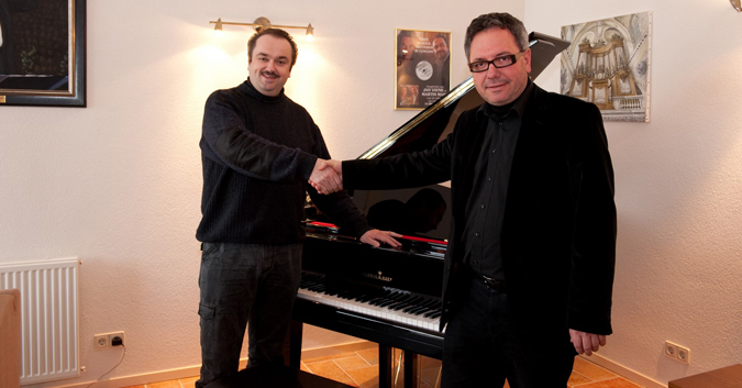 Martin Mans kreeg zijn nieuwe Ludwig & Hoff vleugel geleverd uit handen van Peter Slager, eigenaar van Joh. de Heer Muziekinstrumenten.