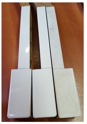 Het klavier van u piano of vleugel kan lijken als nieuw middels een reparatie van het toetsbeleg. Op de foto rechts ziet u de verschillende fases van het reviseren van de toetsen. De rechtertoets is een nog onbewerkte toets. De middelste toets is geschuurd. Het eindresultaat is de linkertoets, die door Cor is geschuurd en gepolijsd.