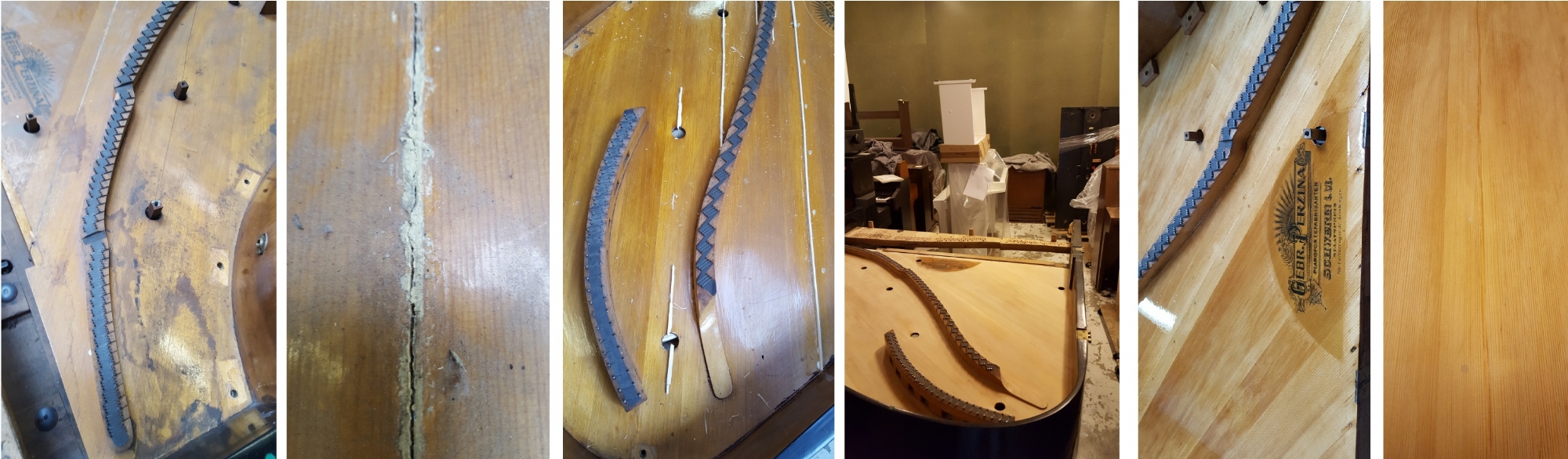 Hieronder is het proces weergegeven van de revisie van een zangbodem. De eerste foto is een onbewerkte zangbodem, die een scheur bevat (zichtbaar op foto 2). Het spieën van de zangbodem is zichtbaar op de derde foto waarna op de vierde foto het eindresultaat zichtbaar is zonder dat de bodem is afgelakt. Op de vijfde foto staat de zangbodem in de lak. Op foto 6 is zichtbaar dat de scheur volledig is weggewerkt.
