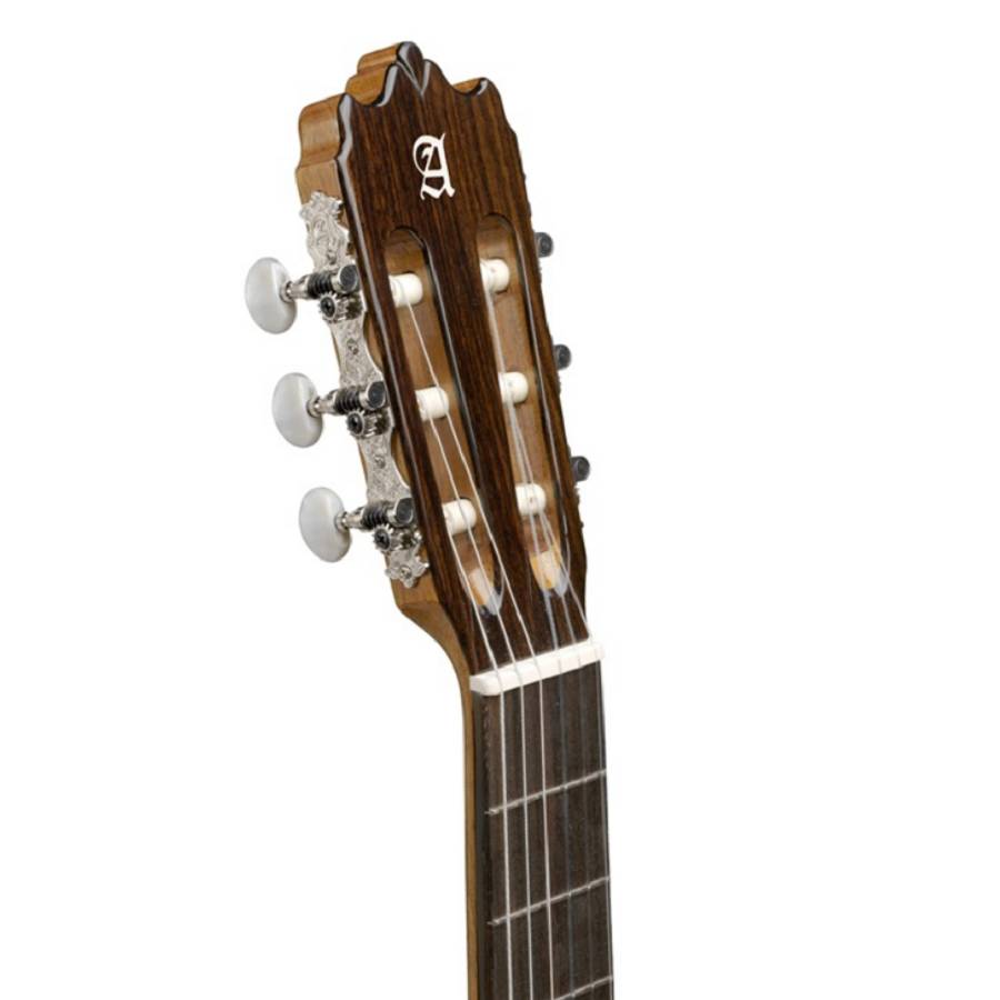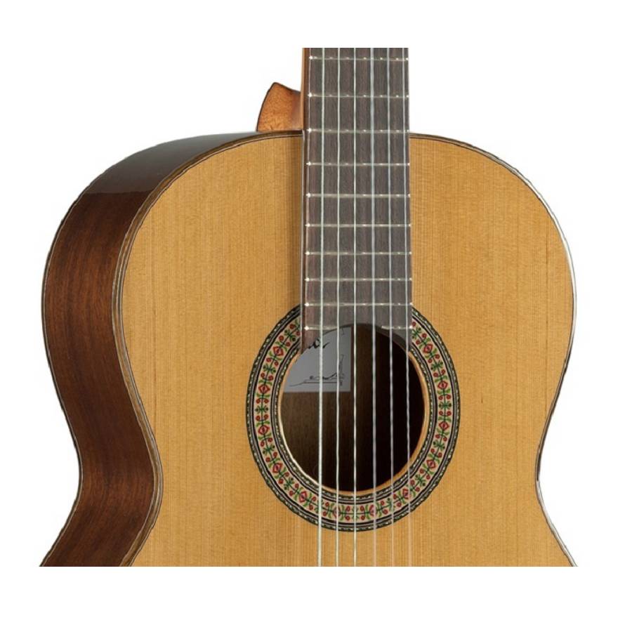 Die Alhambra 3C hat eine Decke aus hochwertigem "a+" Zedernholz. Gitarren mit einer Zederndecke zeichnen sich durch ihren warmen, gleichmäßigen Ton aus, der durch das massive Holz auch sehr voll ist. Die Zargen und der Boden sind aus Mahagoni, einem schönen dunklen Holzart, gefertigt.