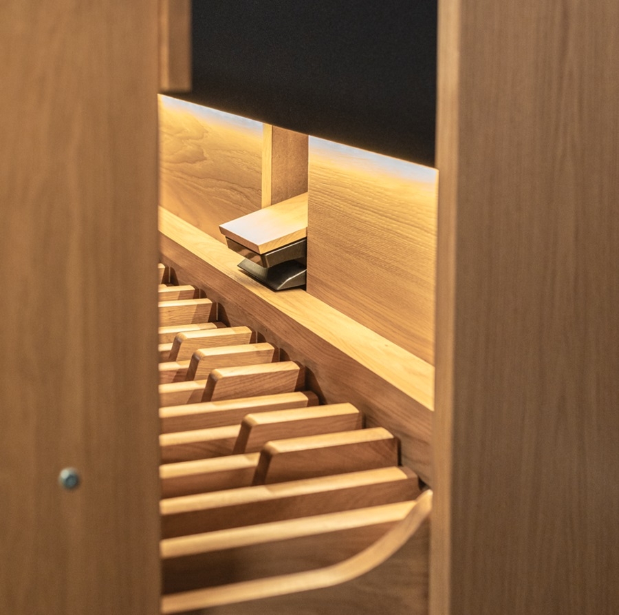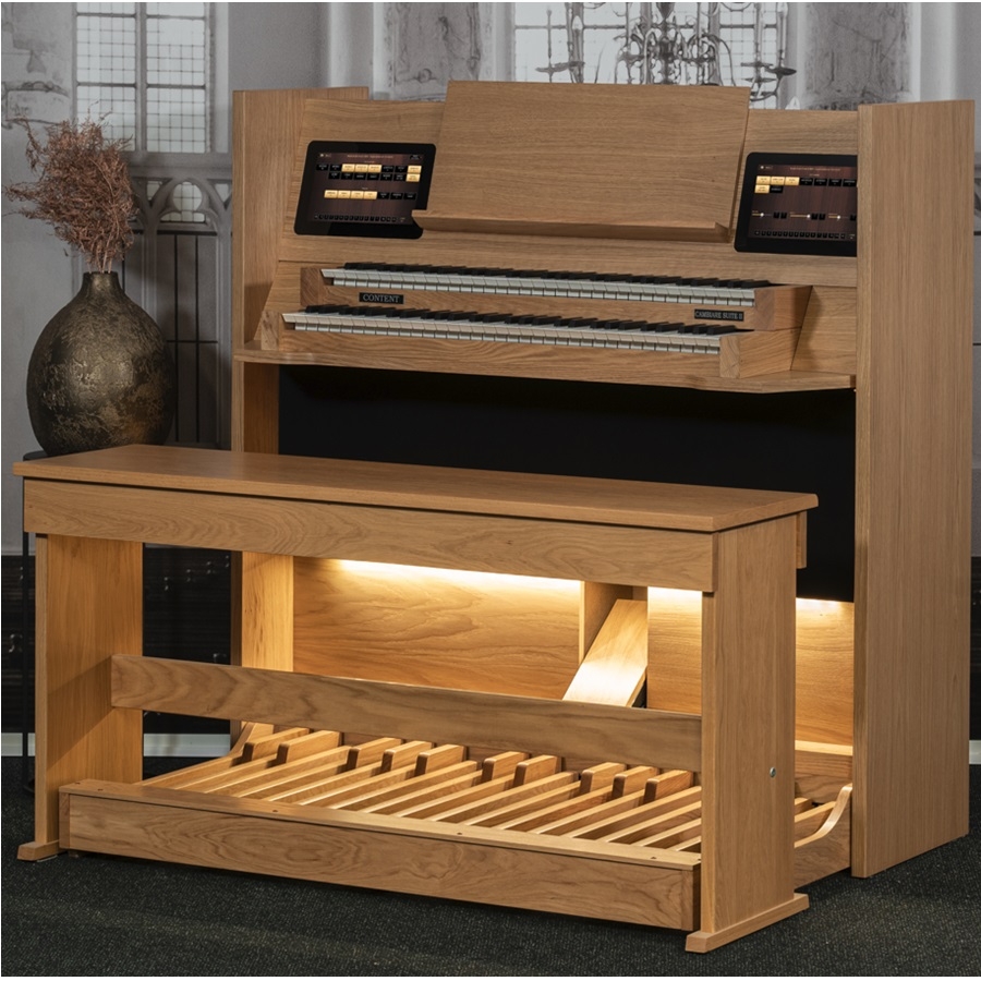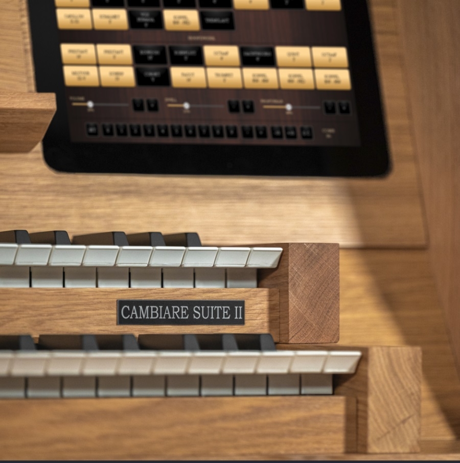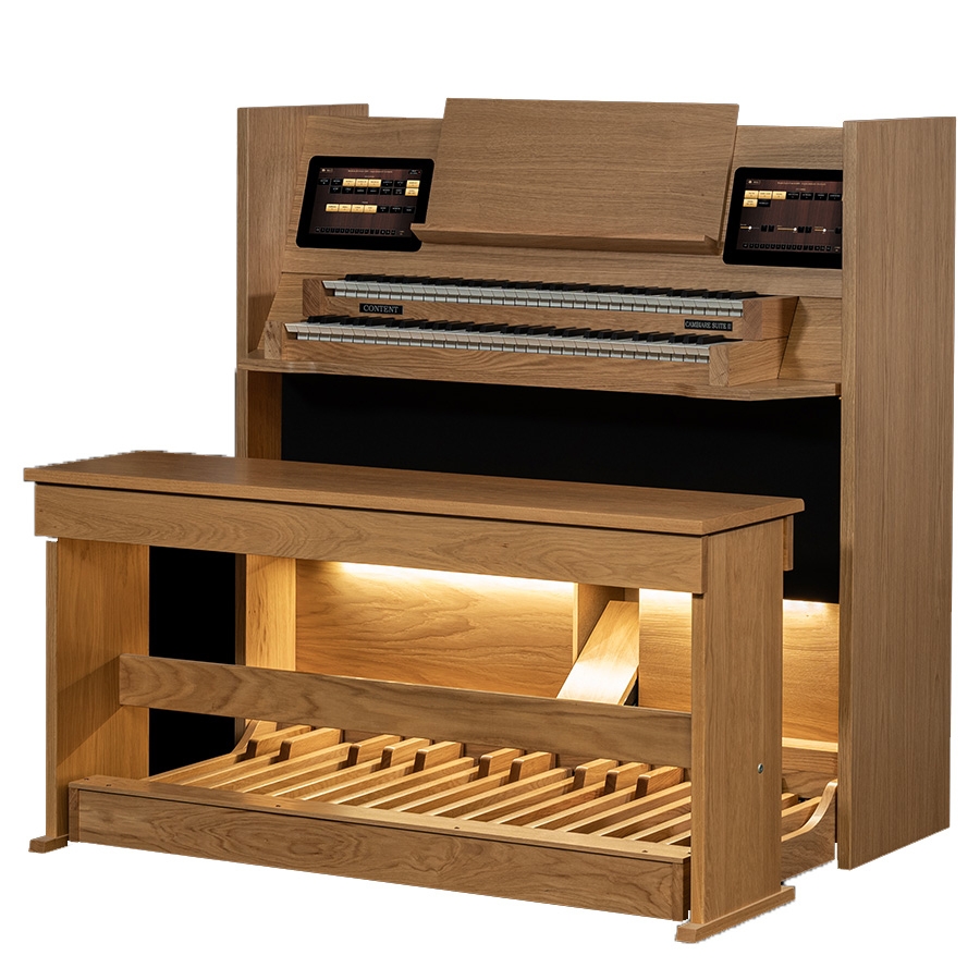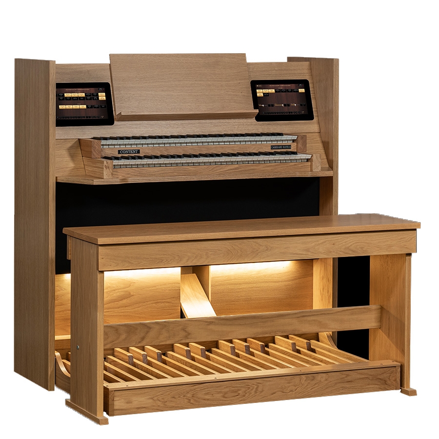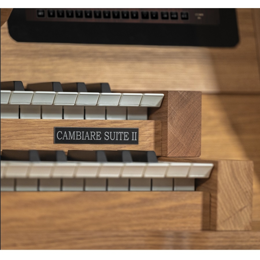 Die Cambiare Suite II ist eine zweimanualige Ausführung. Mit der Cambiare Suite III ist jedoch auch eine dreimanualige Ausführung erhältlich, sodass es für jeden Organisten und jedes Budget ein passendes Modell gibt. Die Cambiare Suite II ist mit einem Mehrkanal-Audiosystem ausgestattet, das vollständig in das massive Eichengehäuse integriert ist. Das langlebige Eichenholz wird sorgfältig ausgewählt, sodass die Orgeln von Content Robustheit und dauerhafte Spielfreude garantieren. Das Gehäuse ist kompakt und dennoch elegant gestaltet und bietet ein optimales Gleichgewicht zwischen Bedienbarkeit und Design. Auch an kleine Details wurde gedacht, beispielsweise die Bank mit Staufach und Pedalbeleuchtung.