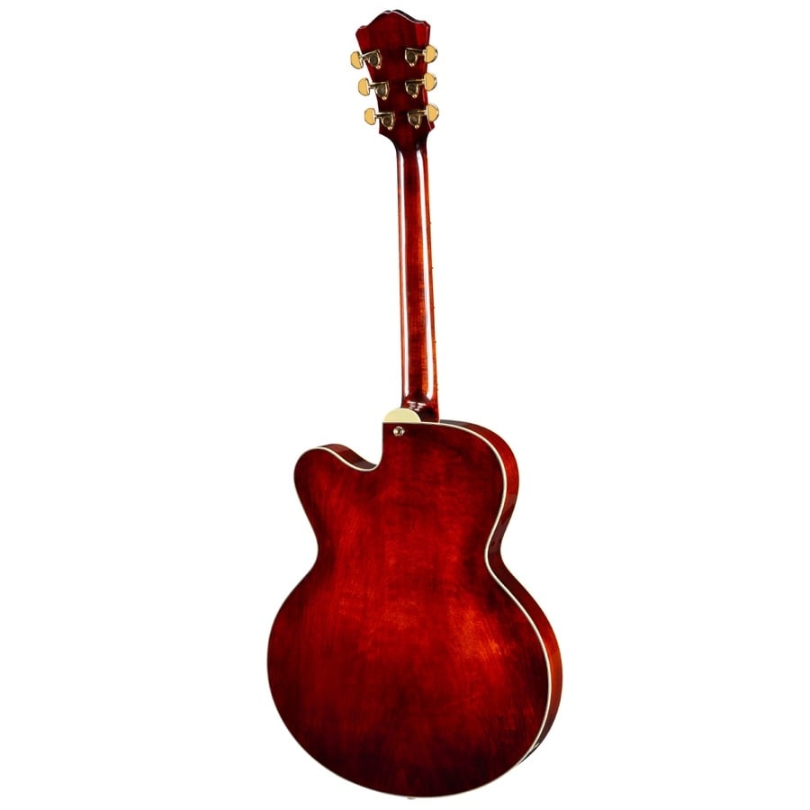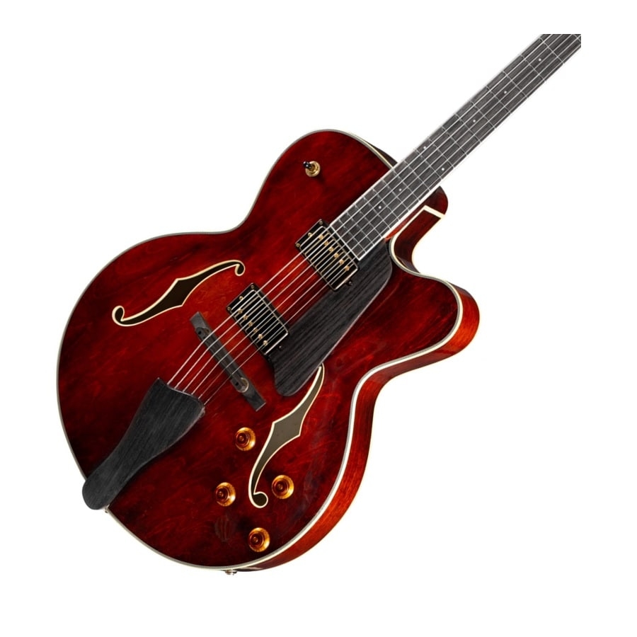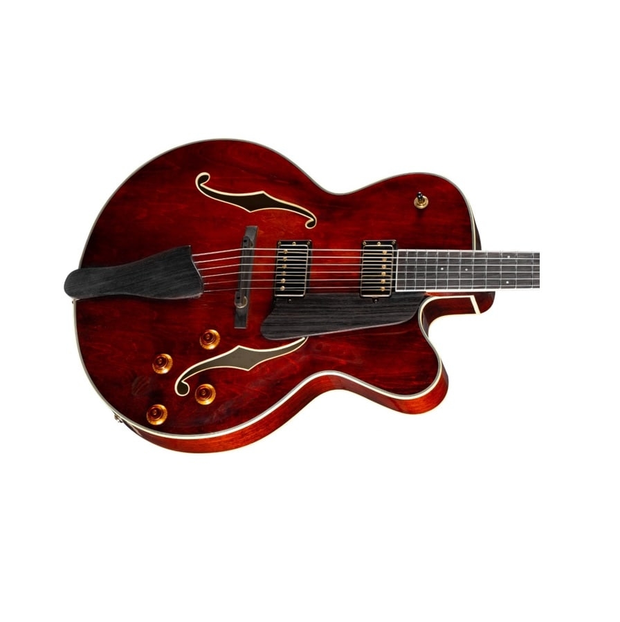 Die AR403CED von Eastman ist eine wunderschöne, professionelle Archtop-Gitarre. Eine Archtop-Gitarre ist genau das, was der Name andeutet: „Archtop” bedeutet im Englischen „gewölbtes Top”. Der Resonanzkörper verläuft also nicht gerade, sondern ist gewölbt. Außerdem haben Archtop-Gitarren immer zwei F-Löcher auf beiden Seiten des Stegs. Diese Konstruktion wurde von Geigen inspiriert, da sich herausstellte, dass die F-Löcher mehr Raum für Resonanz und Projektion schaffen. Eine gewölbte Decke ist daher sehr wichtig, denn die Schallwellen können sich nicht richtig ausbreiten, wenn die Löcher keine abgerundeten Kanten haben. Das bedeutet, dass Archtop-Gitarren hohl sind. Eine Archtop-Gitarre klingt daher viel geräumiger, resonanter und voller als eine Solidbody-Gitarre.