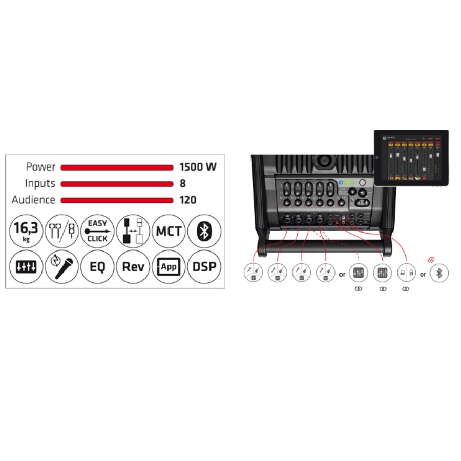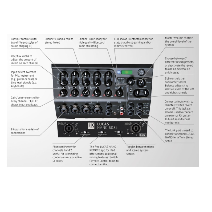 Die LUCAS NANO Modelle sind aktive Kompakt-PAs für Musiker und DJs, die auf professionellen Sound setzen und dabei großen Wert auf einfaches Handling legen. Sein volles Potential entwickelt LUCAS NANO im Stereo-Einsatz, sei es als 2.1-System oder mit der doppelten Power als Twin-Stereo-System: Ideal also für typische Stereo-Anwendungen wie z.B. Keyboard-Entertainer-Auftritte, Partybeschallung als DJ, Musik vom MP3-Zuspieler oder Live-Musik mit mehreren Musikern. Der Bass spielt so druckvoll und tief, dass auch für Tanzmusik keinen Zusatz-Subwoofer benötigt wird. Die Satelliten sind so abgestimmt, dass der Sound klar und mit hoher Sprachverständlichkeit bis in die hinteren Reihen des Raums getragen wird. Und das bei einfachstem Handling und extrem geringen Gewicht. So kann ein gesamtes Stereo-PA-Setup mit nur einer Hand transportiert und in Sekunden aufgebaut werden. Der All-in-One NANO: acht Eingänge, Digitalmischpult, integrierte Halleffekte, App-Steuerung für iPad, intuitive EQ- und Kompressorfunktionen, Bluetooth Audio Streaming – LUCAS NANO 608i ist perfekt geeignet für alle, die ein PA-System haben wollen, das mit allen denkbaren Raffinessen ausgestattet ist und gleichzeitig mit nur einer Hand transportiert werden kann.