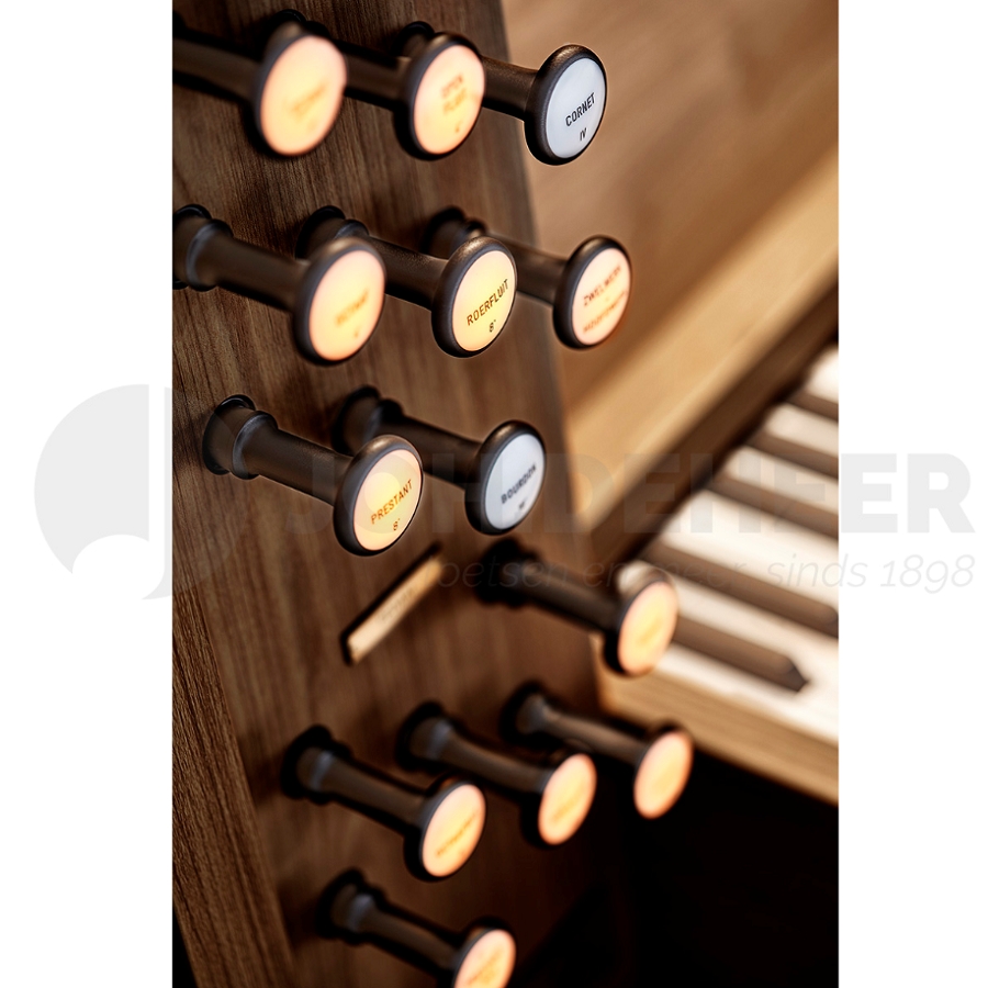 Sowohl Anfänger als auch fortgeschrittene Organisten, die hohe Anforderungen an den Klang stellen, werden von der Studio P-150 begeistert sein. Diese Positiv-Ausführung der Studio sorgt für einen unübertroffenen Pfeifenorgeleindruck. Das hohe Möbel erinnert an die Spieltische klassischer Pfeifenorgeln. Auch die beleuchteten Zugregister tragen zu dieser Ausstrahlung bei. Die Orgeltöne erklingen über Lautsprecher im oberen Bereich der Orgel, wodurch sie direkt das Ohr des Spielers erreichen. Das sorgt für einen natürlichen und sehr hochwertigen Klang. Die Studio P-150 ist mit zwei Manualen, 28 Stimmen und einem hochwertigen 2.1-Audiosystem ausgestattet. Die Orgel ist in vier Farben lieferbar und passt dadurch in jedes Interieur.
