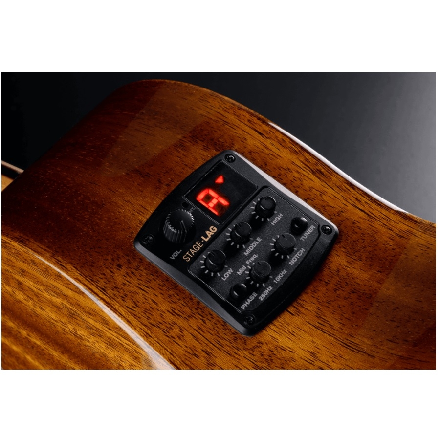 Die T98ACE ist eine markante Auditorium-Gitarre von Lâg. Lâg ist ein französisches Unternehmen, das solide Gitarren zu einem niedrigen Preis entwickelt. Die T98ACE ist Teil der Tramontane-Serie, in der sie authentische französische Gitarrenbautechniken auf moderne Modelle übertragen haben. Die 98 steht dafür, dass die Gitarre größtenteils aus Khaya besteht, einschließlich der massiven Decke und des Halses. Khaya ist ein gutes Holz für den Gitarrenbau, da es für einen ausgewogenen Klang und einen warmen Klang sorgt. Darüber hinaus sorgt es für ein schönes Aussehen; das dunkle Holz sieht sehr gut aus mit dem dunklen Steg und der Kopfplatte und der charakteristischen Lâg-Rosette. Darüber hinaus ist dies eine Auditorium-Gitarre, was sie zu einer sehr vielseitigen Gitarre macht, auf die Sie mehrere Spielstile anwenden können. Darüber hinaus ist es auch eine elektrisch-akustische Gitarre, was bedeutet, dass es verstärkt werden kann. Lâg hat dafür die Stage Lâg Elektronik verwendet, die dafür sorgt, dass das Signal so authentisch wie möglich interpretiert wird. Kurz gesagt, eine sehr schöne Auditorium-Gitarre zu einem vernünftigen Preis!