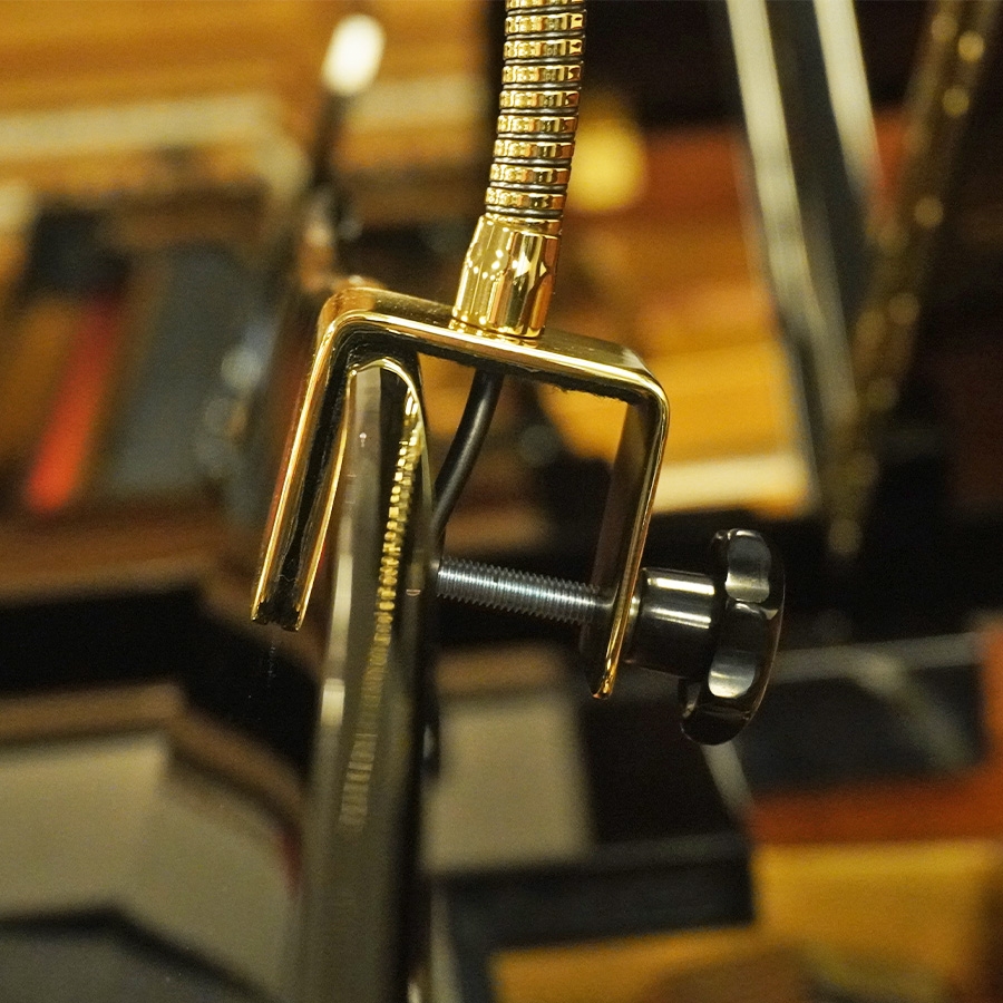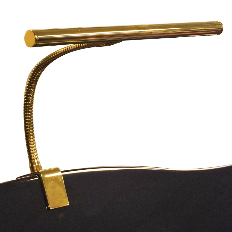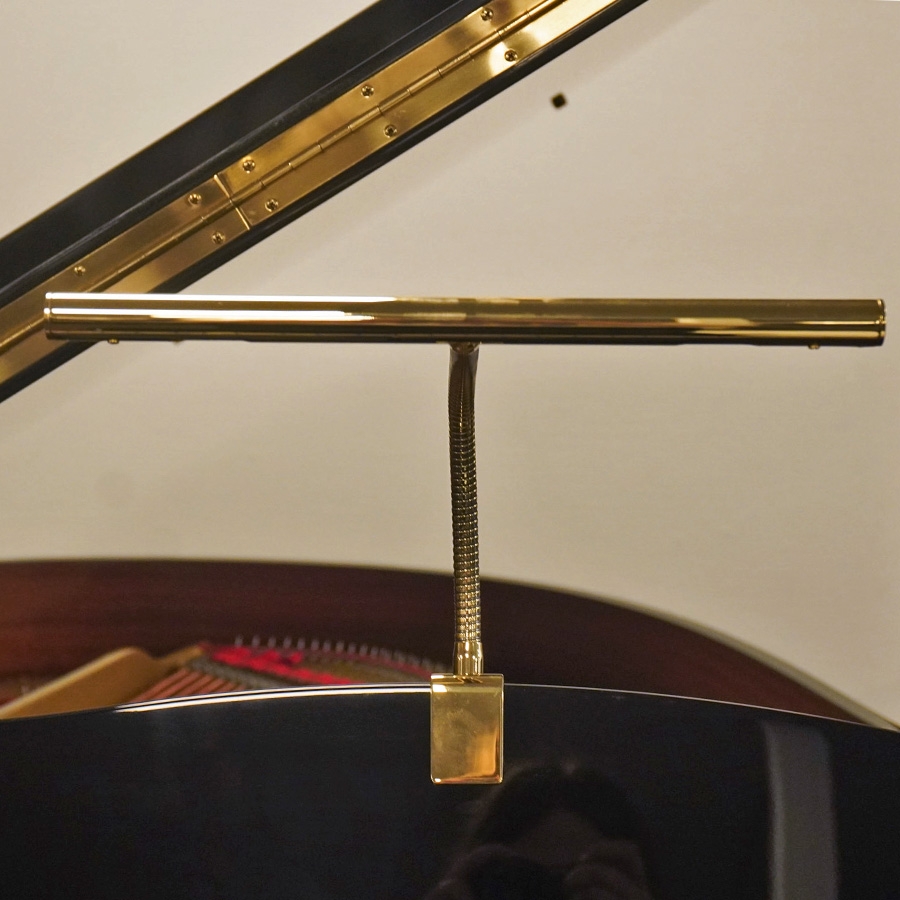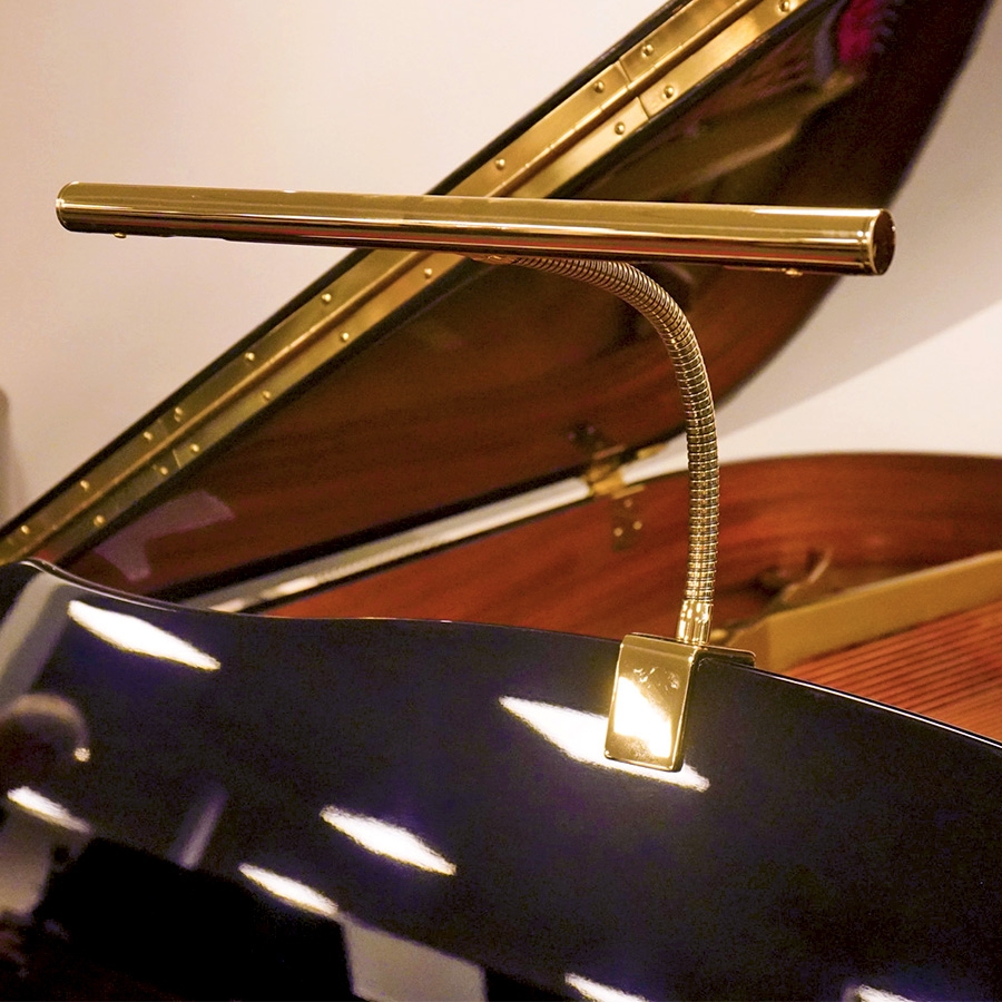 Die Ludio VL-10MP ist eine hochwertige, in Deutschland handgefertigte Lampe für Flügel. Die VL-10 lässt sich mithilfe eines Schraubmechanismus einfach am Notenpult des Flügels befestigen. Zwei LED-Streifen mit insgesamt 24 Lämpchen sorgen für ein angenehmes, warmes Licht, das die Noten perfekt ausleuchtet. Die Lampe verfügt über einen kleinen Schwanenhals, mit dem sich der ideale Lichtwinkel einfach einstellen lässt.