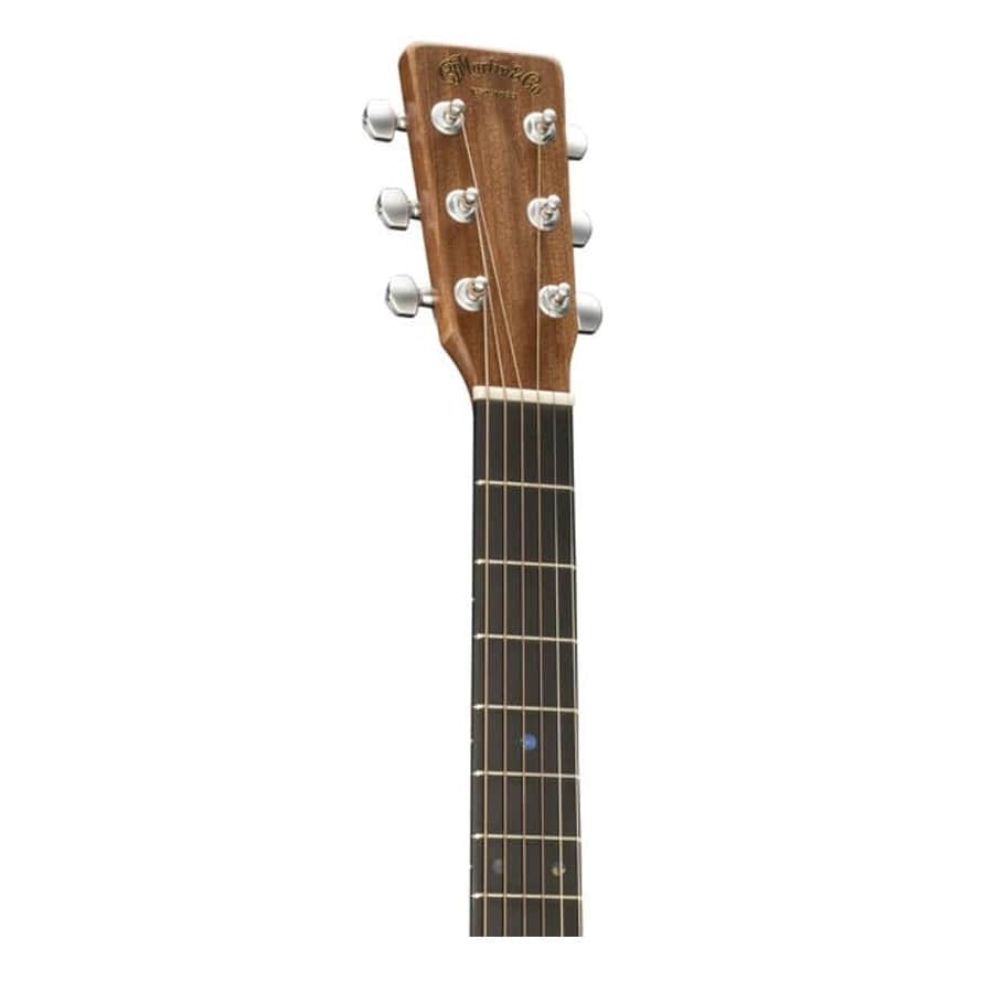Die 000C Jr E StreetMaster ist Martins Vision von einem kleineren Orchestra. Decke, Boden und Zargen sind aus massivem Sapele gefertigt. Dies ist ein hochwertiges Holz, das eine gute Resonanz erzeugt und einen wunderbar klaren Sound produziert. Das Griffbrett der Gitarre ist aus Richlite gefertigt. Das ist ein umweltfreundliches Material, das aus recycelten Holzspänen und Harz besteht. Obwohl es sich um eine Art Kunststoff handelt, spielt es sich genauso fein wie Ahorn oder Mahagoni, und der Unterschied ist fast nicht zu spüren. Außerdem muss ein Richlite-Griffbrett nicht gereinigt oder geölt werden. Richlite ist bereits behandelt und wird sich nicht verziehen oder reißen. Der Hals ist aus „ausgesuchtem Hartholz“ gefertigt, d. h. er besteht aus Zedernholz oder Mahagoni, je nachdem, welche Holzart Martin ohne Beteiligung an der Abholzung von Wäldern beziehen kann. Beide Hölzer eignen sich gut als Hälse, und der Unterschied zwischen den beiden ist minimal.