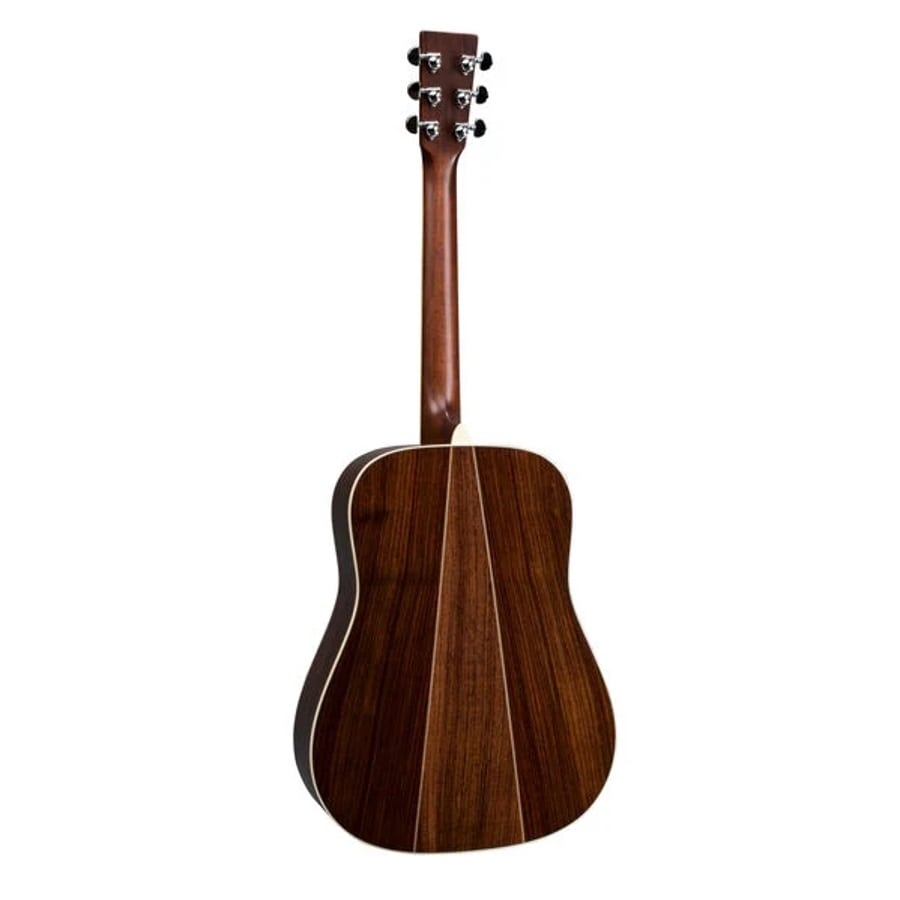 Die D-35 ist eine Dreadnought-Gitarre. Dreadnoughts sind sehr beliebt, da sie enorm vielseitig sind und einen vollen, satten Sound erzeugen. Sie sind ideale Rhythmusgitarren, aber auch das Fingerstyle-Picking auf einer Dreadnought klingt großartig. Außerdem muss man für eine Dreadnought wirklich zu Martin gehen, denn sie haben die Dreadnought erfunden und gehören zu den Besten, was die Entwicklung angeht. Die D-35 hat eine Decke aus Fichtenholz. Fichtenholz hat eine gute Resonanz und erzeugt einen warmen, schönen Sound. Der Boden und die Zargen sind aus indischem Palisander gefertigt. Palisander hat eine schöne dunkle Farbe und erzeugt einen warmen, resonanten Sound. Der Hals besteht aus „Select Hardwood”, d. h. aus Zeder oder Mahagoni, je nachdem, welche Holzart Martin ohne Beteiligung an der Abholzung von Wäldern beziehen kann. Beide Hölzer eignen sich gut für den Hals, und der Unterschied zwischen ihnen ist minimal. Das Griffbrett ist aus Ebenholz gefertigt, das eine gute Spielfläche bietet. Kurzum, eine schöne Gitarre – ästhetisch wie musikalisch!