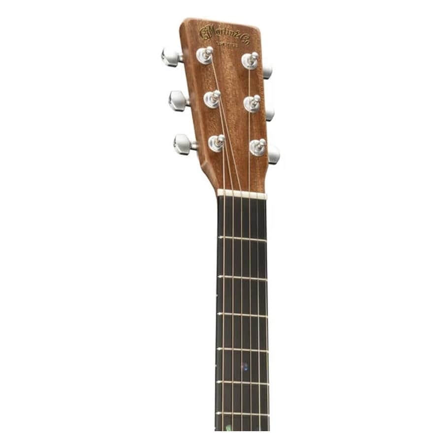 Die D Jr E Streetmaster ist Martins Vision einer kleineren Dreadnought. Decke, Boden und Zargen sind aus massivem Sapele gefertigt. Dies ist ein hochwertiges Holz, das eine gute Resonanz erzeugt und einen wunderbar klaren Sound hervorbringt. Das Griffbrett der Gitarre ist aus Richlite gefertigt. Das ist ein umweltfreundliches Material, das aus recycelten Holzspänen und Harz besteht. Obwohl es sich um eine Art Kunststoff handelt, spielt es sich genauso fein wie Ahorn oder Mahagoni, und der Unterschied ist fast nicht wahrnehmbar. Darüber hinaus muss ein Richlite-Griffbrett nicht gereinigt oder geölt werden. Richlite ist bereits behandelt und wird sich nicht verziehen oder reißen. Der Hals ist aus „Select Hardwood“ gefertigt, d. h. er besteht aus Zedernholz oder Mahagoni, je nachdem, welche Holzart Martin ohne Beteiligung an der Abholzung von Wäldern beziehen kann. Beide Hölzer eignen sich gut als Hälse, und der Unterschied zwischen den beiden ist minimal.