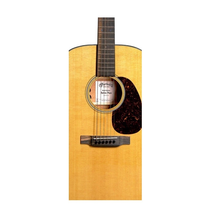 Die DE Retro Plus ist eine der Road Series Dreadnoughts. Dreadnoughts sind sehr beliebt, sie sind enorm vielseitig und produzieren einen sehr vollen und satten Sound. Sie sind die idealen Rhythmusgitarren, aber auch das Fingerstyle-Picking auf einer Dreadnought klingt großartig. Außerdem muss man für eine Dreadnought wirklich zu Martin gehen, denn sie haben die Dreadnought erfunden und gehören zu den Besten, was die Entwicklung angeht. Die DE Retro Plus hat eine Decke aus gerösteter Fichte. Fichte hat eine gute Resonanz und erzeugt einen schönen warmen Sound. Boden und Zargen sind aus Mahagoni gefertigt. Mahagoni hat eine schöne dunkle Farbe und erzeugt einen warmen und kräftigen Sound. Außerdem betont der Sound vor allem die Mitteltöne, was ihm einen ausgewogenen Sound verleiht. Der Hals besteht aus „Select Hardwood“, das heißt aus Zedernholz oder Mahagoni, je nachdem, welches Holz Martin geliefert bekommt, ohne sich an der Abholzung beteiligen zu müssen. Beide Hölzer eignen sich gut für den Hals, und der Unterschied zwischen ihnen ist minimal. Das Griffbrett ist aus Ebenholz gefertigt, das eine gute Spielfläche bietet. Kurzum, eine schöne Gitarre – ästhetisch wie musikalisch!