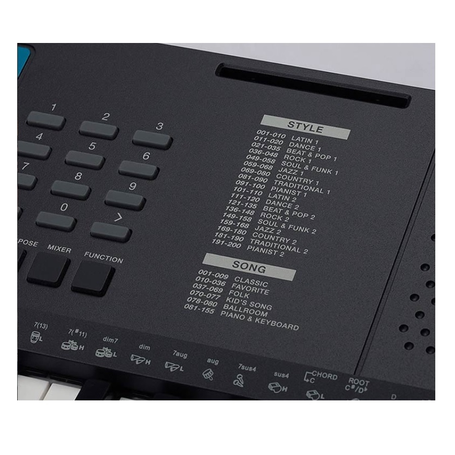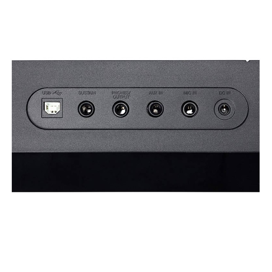 Aansluitingen: DC-power, hoofdtelefoon (1/4" jack), Sustain (1/4" jack), USB, Aux-In (1/4" stereo jack), Aux-out (1/4" stereo jack)
