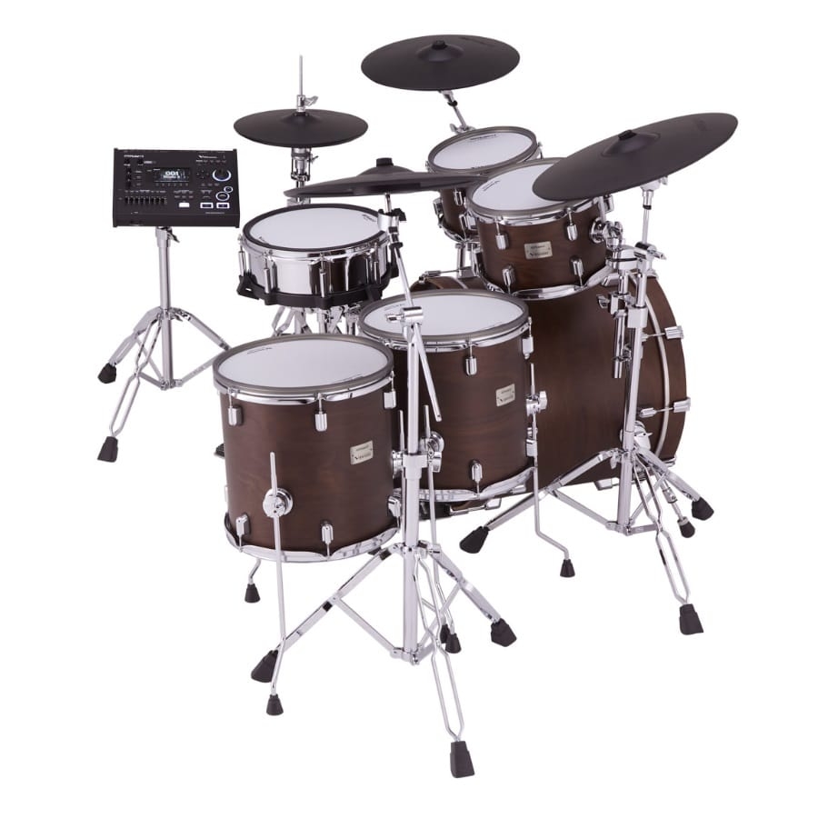 Natürlich lassen sich auch eigene Sounds hinzufügen. Außerdem kann man das Modul über den MIDI-Anschluss direkt an die DAW anschließen und sein Spiel direkt aufnehmen. Die Serie umfasst zwei Drumsets in der TD-Version, also wie die echten Original-Digital Drums von Roland, eine VAD-Version, die aussieht und sich anfühlt wie ein akustisches Drumset, und das V71-Modul ist auch separat erhältlich, wenn Sie es mit Ihrem eigenen Kit verwenden möchten.
