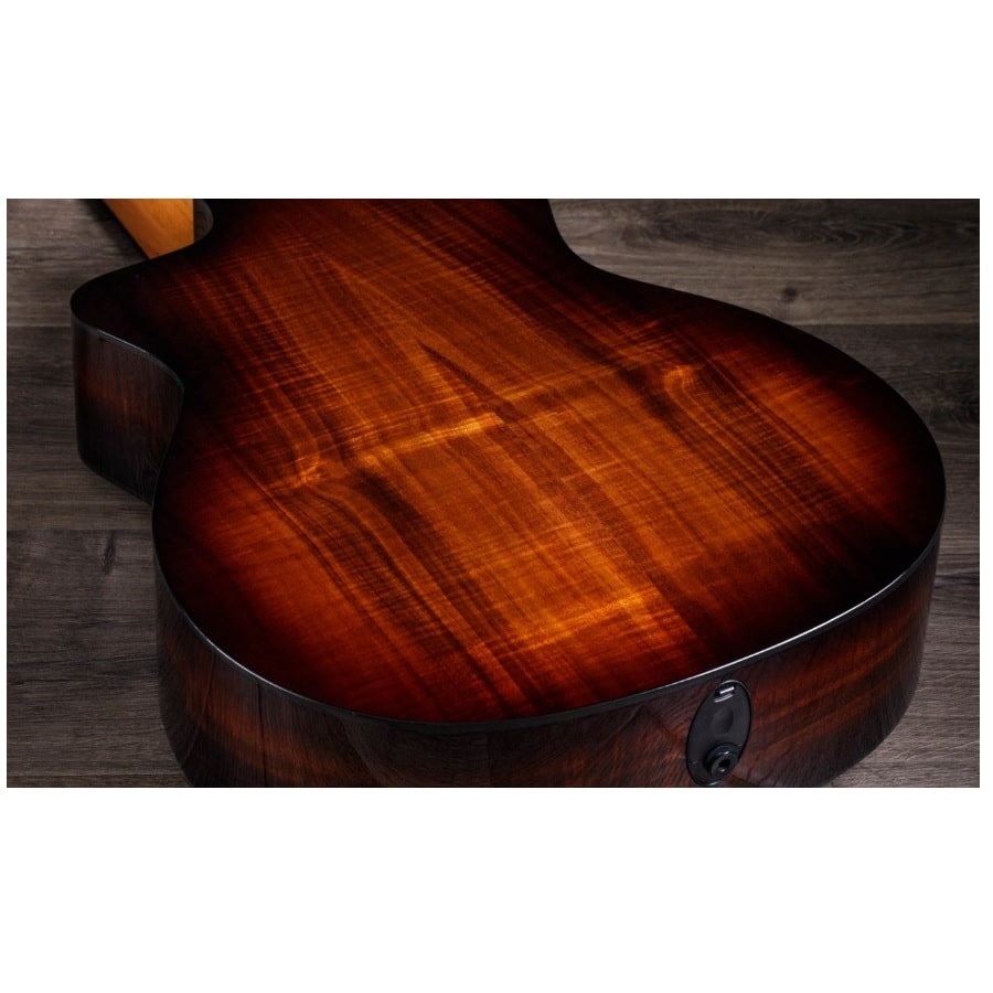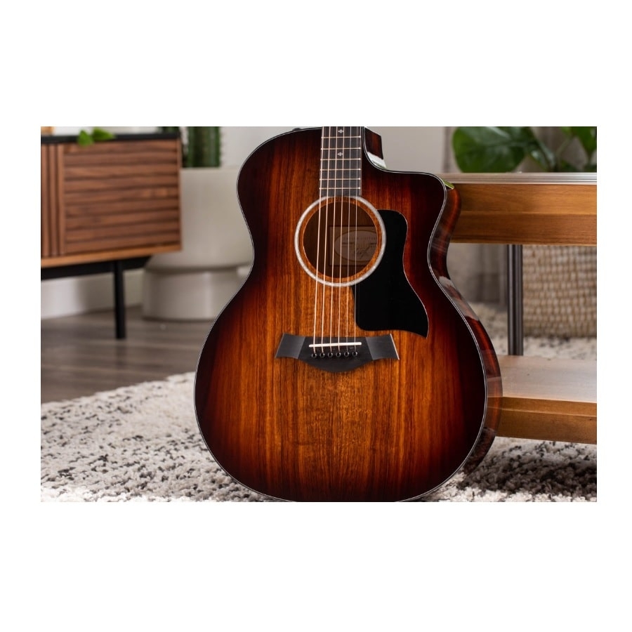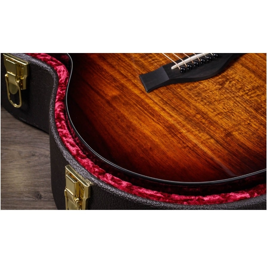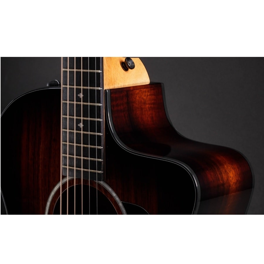 Die 224ce-K DLX ist eine einzigartige Gitarre. Ihr Resonanzboden besteht aus massiver Koa-Decke, -Zarge und -Boden. Dies sorgt für einen klaren und kraftvollen Sound. Koa ist ein hawaiianisches Holz, das für einen schönen Sound sorgt, der mit der Zeit noch schöner wird. Das bedeutet, dass die Gitarre mit Ihnen altert. Sie hat einen Mahagoni-Hals und ein Griffbrett aus Ebenholz. Sie hat einen Grand-Auditorium-Korpus. Diese Form wurde 1994 bei Taylor entwickelt und ist eine der beliebtesten. Die Grand Auditorium ist etwas kleiner als eine Dreadnought, aber etwas größer als eine Grand Concert. Sie ist die vielseitigste der drei Gitarren, denn Dreadnoughts eignen sich vor allem für Rhythmusgitarre und Grand Concerts zum Strumming. Die Grand Auditorium hingegen ist speziell für die Kombination aus beiden Instrumenten konzipiert. Außerdem ist die Gitarre mit einer ES2-Elektronik ausgestattet, sodass sie sich gut verstärken lässt, und sie wird mit einem Koffer geliefert.