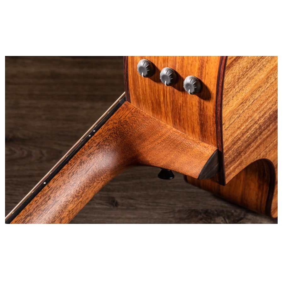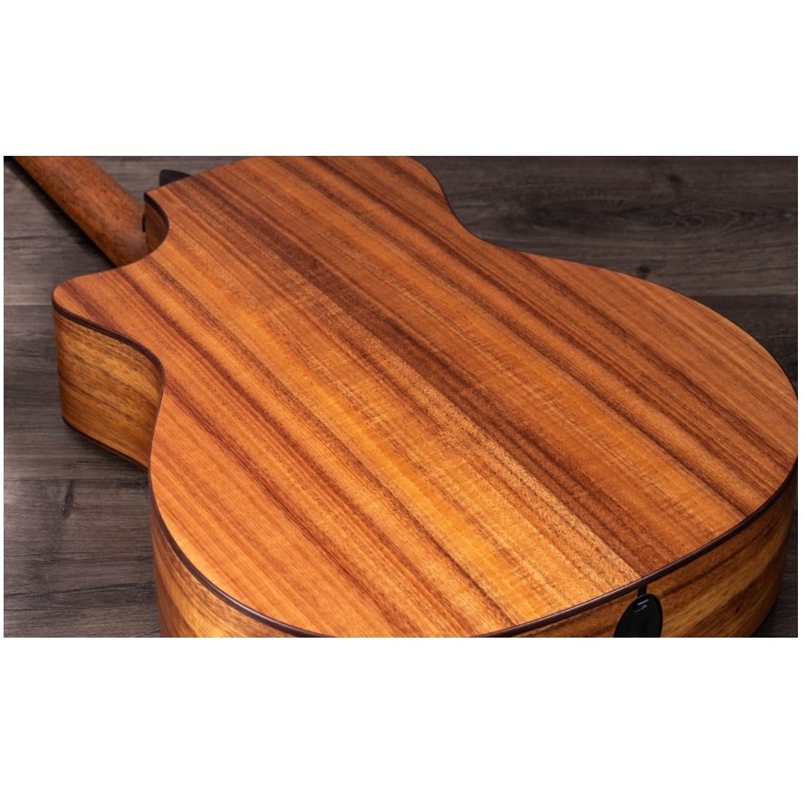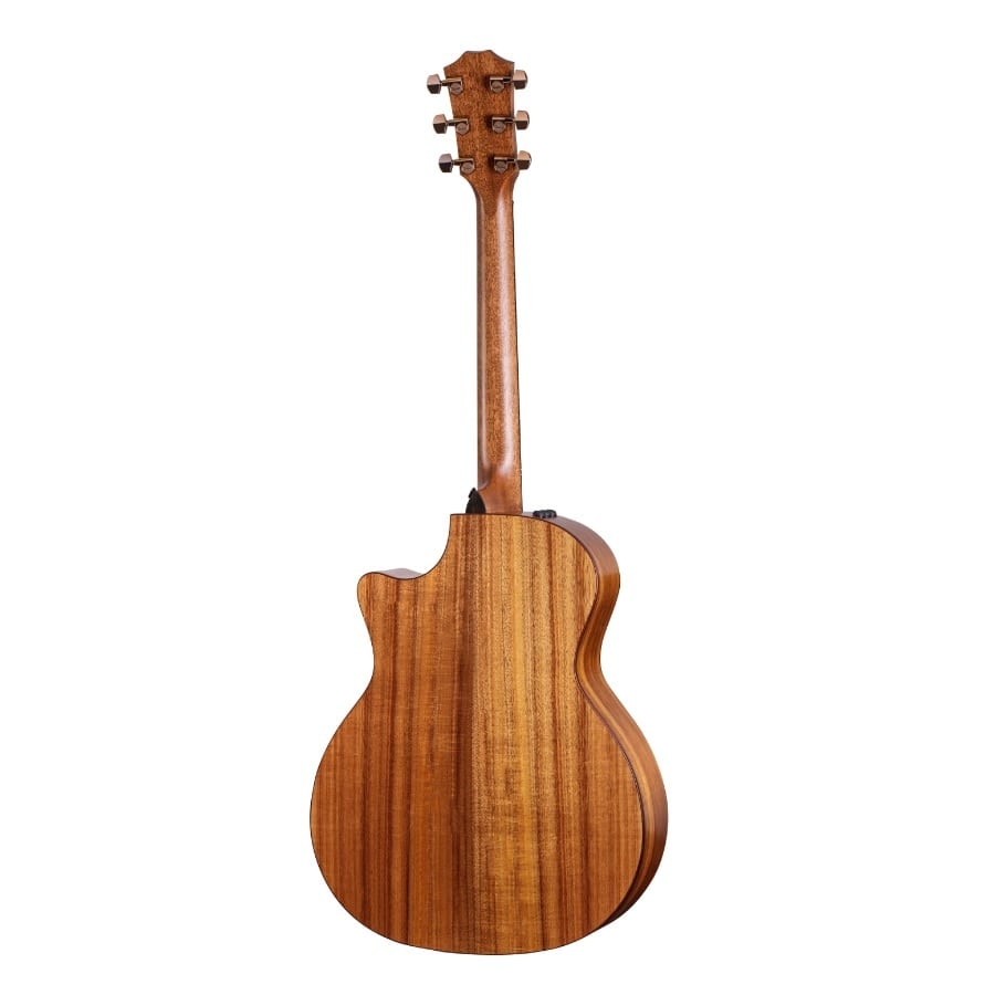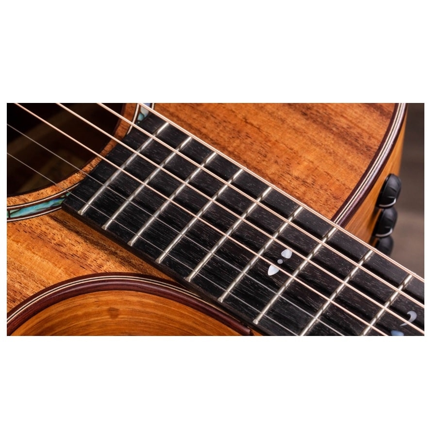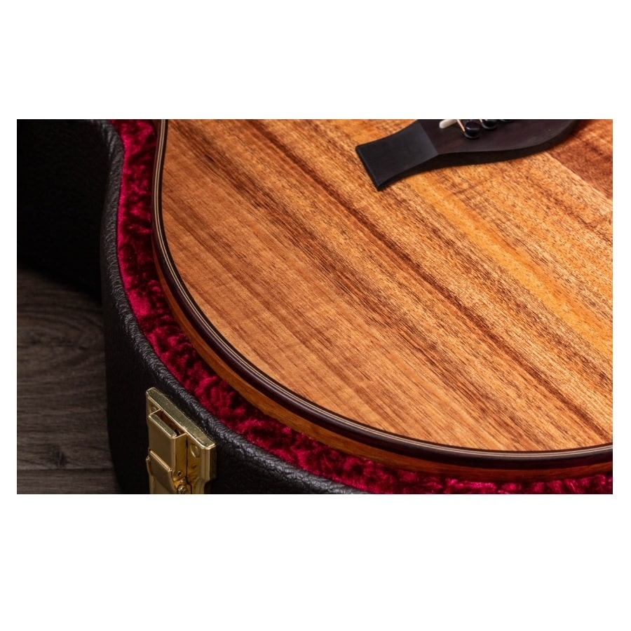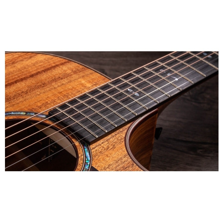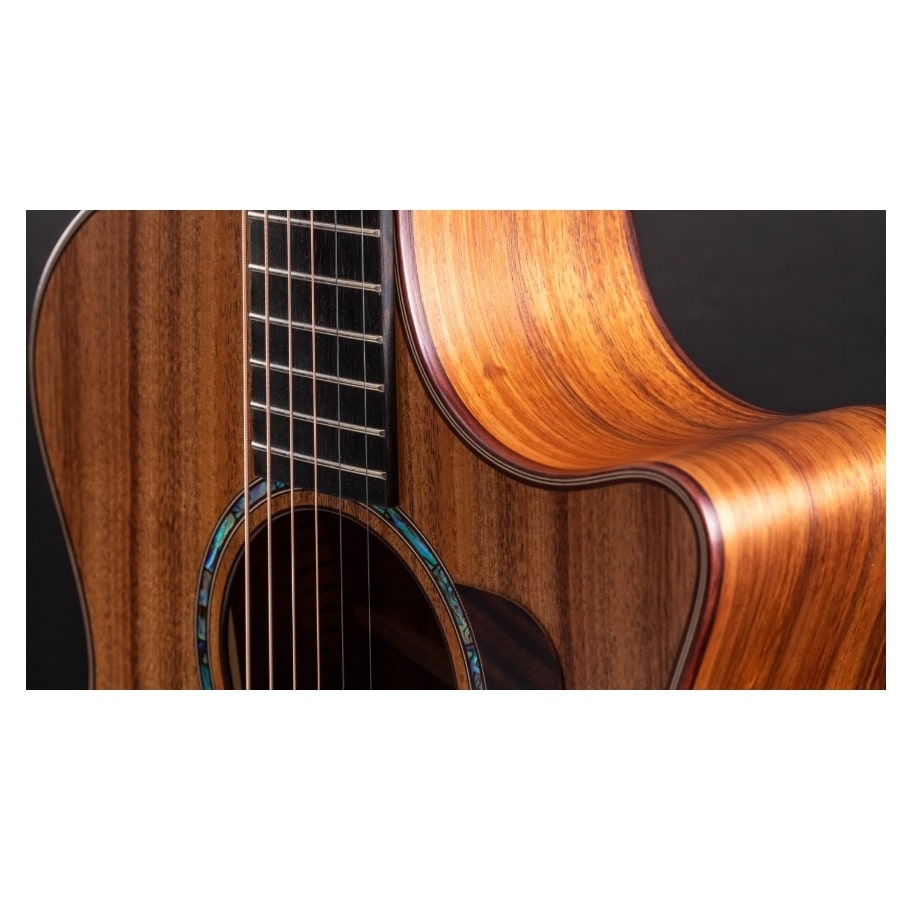 Die 724ce ist eine wunderschöne Gitarre. Ihr Resonanzkörper besteht aus einer massiven Koa-Decke sowie Zargen und Boden. Sie hat einen Mahagoni-Hals und ein Griffbrett aus Ebenholz. Die Gitarre hat einen Grand-Auditorium-Korpus. Diese Form wurde 1994 von Taylor entwickelt und ist eine der beliebtesten. Die Grand Auditorium ist etwas kleiner als eine Dreadnought, aber etwas größer als eine Grand Concert. Sie ist die vielseitigste der drei Gitarrenformen, denn Dreadnoughts eignen sich hauptsächlich für die Rhythmusgitarre und Grand Concerts für das Strumming. Die Grand Auditorium hingegen ist speziell für die Kombination dieser beiden Instrumente konzipiert. Außerdem ist die Gitarre mit einer ES2-Elektronik ausgestattet, sodass sie sich gut verstärken lässt, und sie wird mit einem Koffer geliefert.