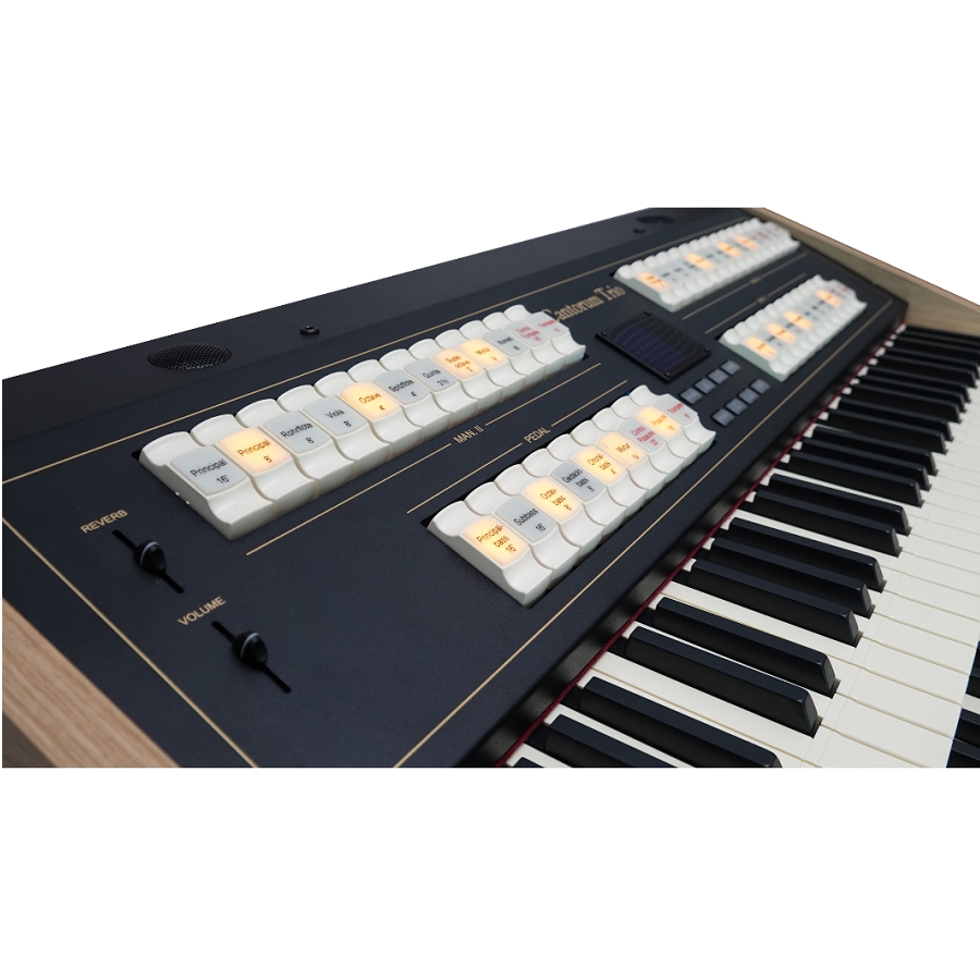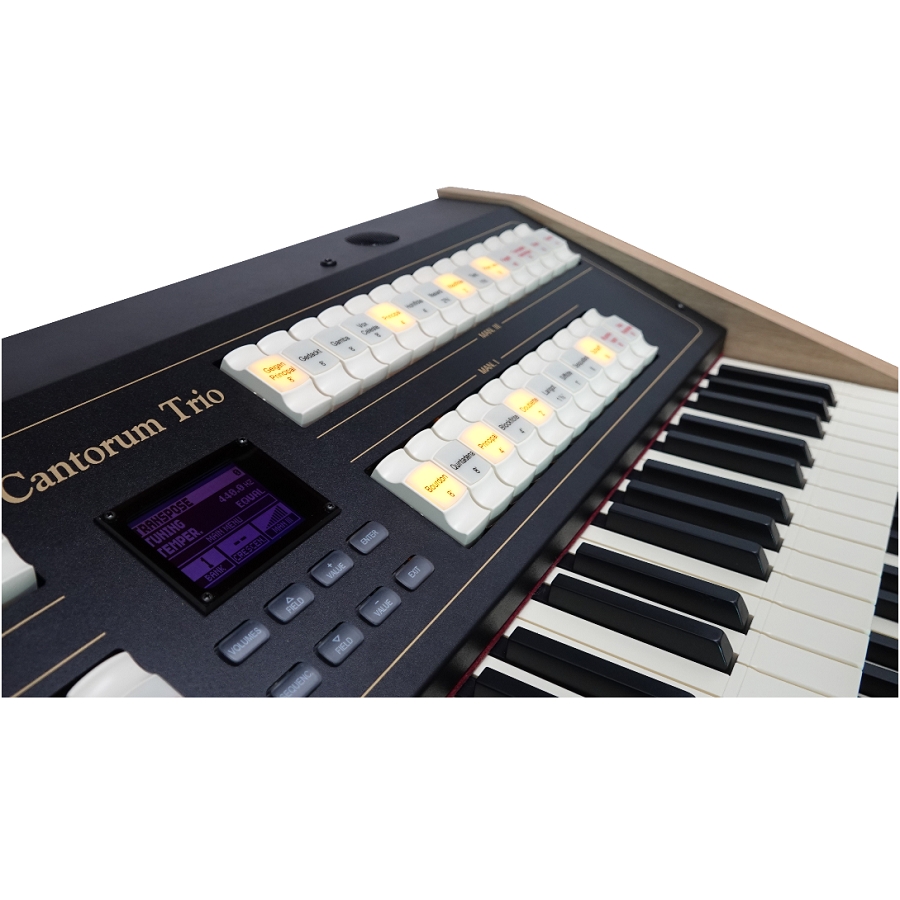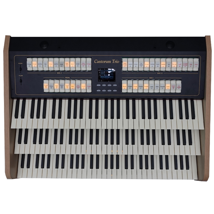 Das Viscount Cantorum Trio garantiert viele Stunden Spielspaß. Das kompakte Keyboard ist mit 46 Stimmen ausgestattet, die auch in vier Klangstilen gespielt werden können; barock, norddeutsch barock, romantic und symphonic. Die Wiedergabe der 9 Pedalregister erfolgt durch die automatische Pedalfunktion. Optional kann auch ein Midi-Bass-Pedal angeschlossen werden. 8 verschiedene Hall-Optionen geben die Möglichkeit, die Orgel großartiger wie in einer Kathedrale oder sehr subtil wie eine kleine Kapelle klingen zu lassen. Als zusätzliche Ergänzung gibt es im Trio auch vier Orchesterstimmen.