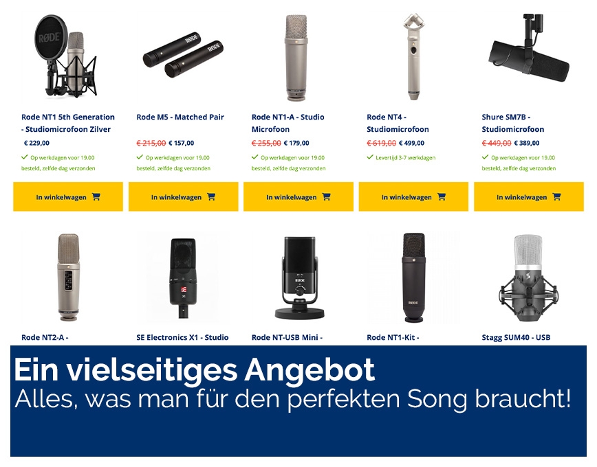 Bei Joh.deHeer hört es nicht bei den Instrumenten auf. Wir haben auch Zubehör für Studioaufnahmen. Vom Podcast bis zur Single und vom Voice-over bis zu den Stimmen eines Animationsfilms, wir haben das nötige Equipment.